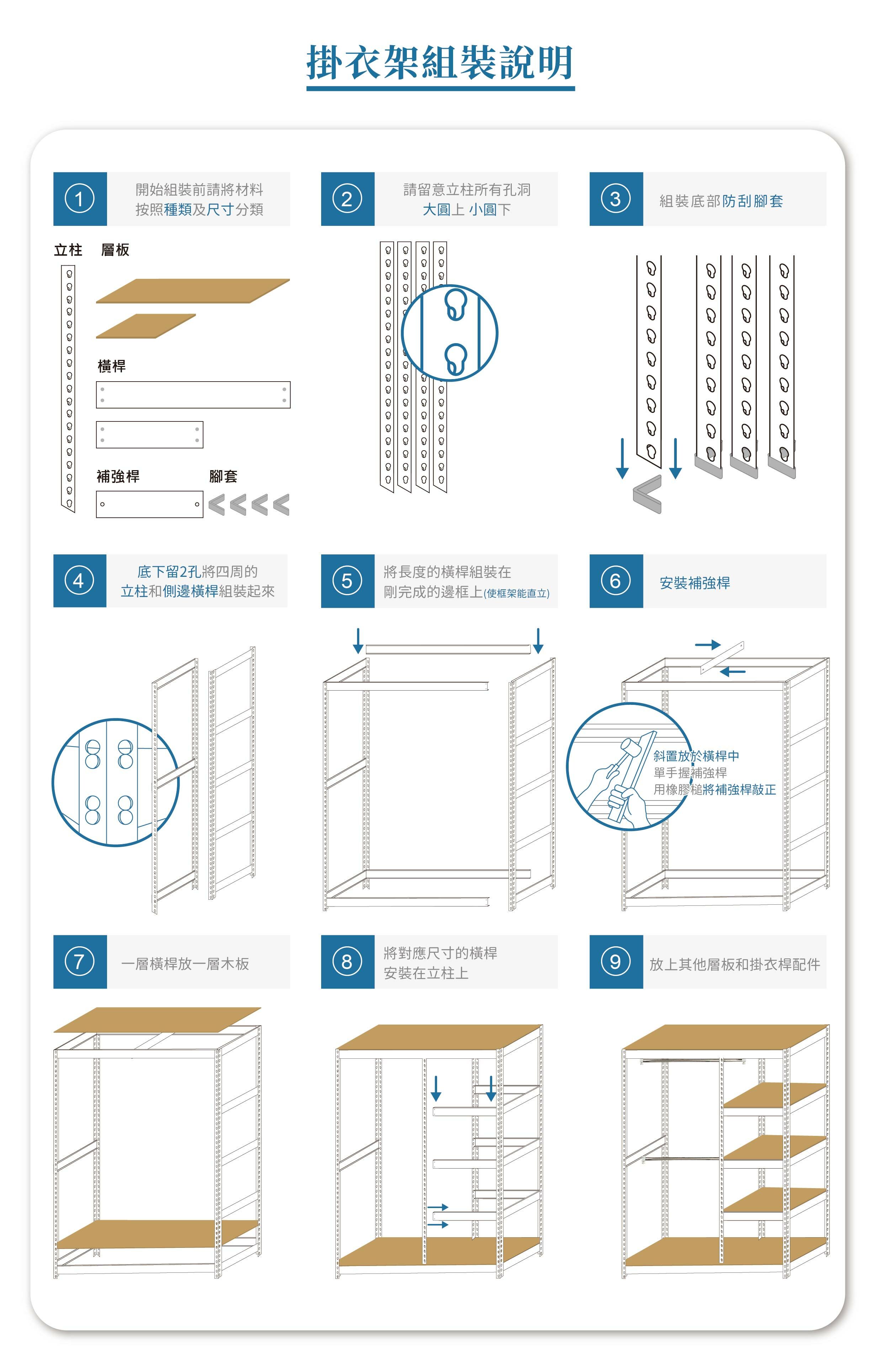 內容:橫桿長邊10支、橫桿深度11支、補強桿1支、立柱6支、板5片、白鐵吊衣桿2支、吊衣桿掛勾4個